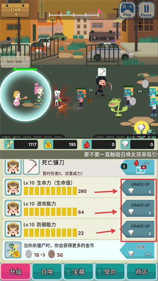 3、還可以消耗鉆石升級(jí)生命力、進(jìn)攻能力、防御能力,借助死亡鐮刀殺僵尸獲得更多金幣的機(jī)制,提升角色綜合戰(zhàn)力。