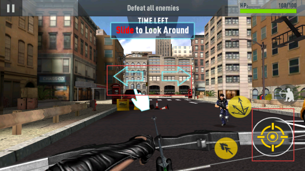 2、戰(zhàn)斗中按照【Slide-to-Look-Around】提示,滑動(dòng)屏幕觀察四周,瞄準(zhǔn)敵人發(fā)起攻擊。