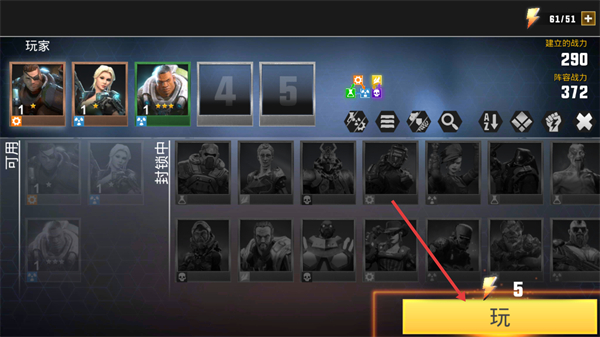1、在英雄陣容界面,搭配不同英雄組成戰(zhàn)隊,點擊“玩”按鈕進入戰(zhàn)斗關卡。