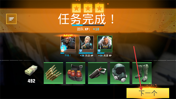 4、任務完成后,獲得團隊經驗和資源獎勵,點擊“下一個”按鈕,繼續(xù)挑戰(zhàn)后續(xù)關卡,提升戰(zhàn)隊實力。