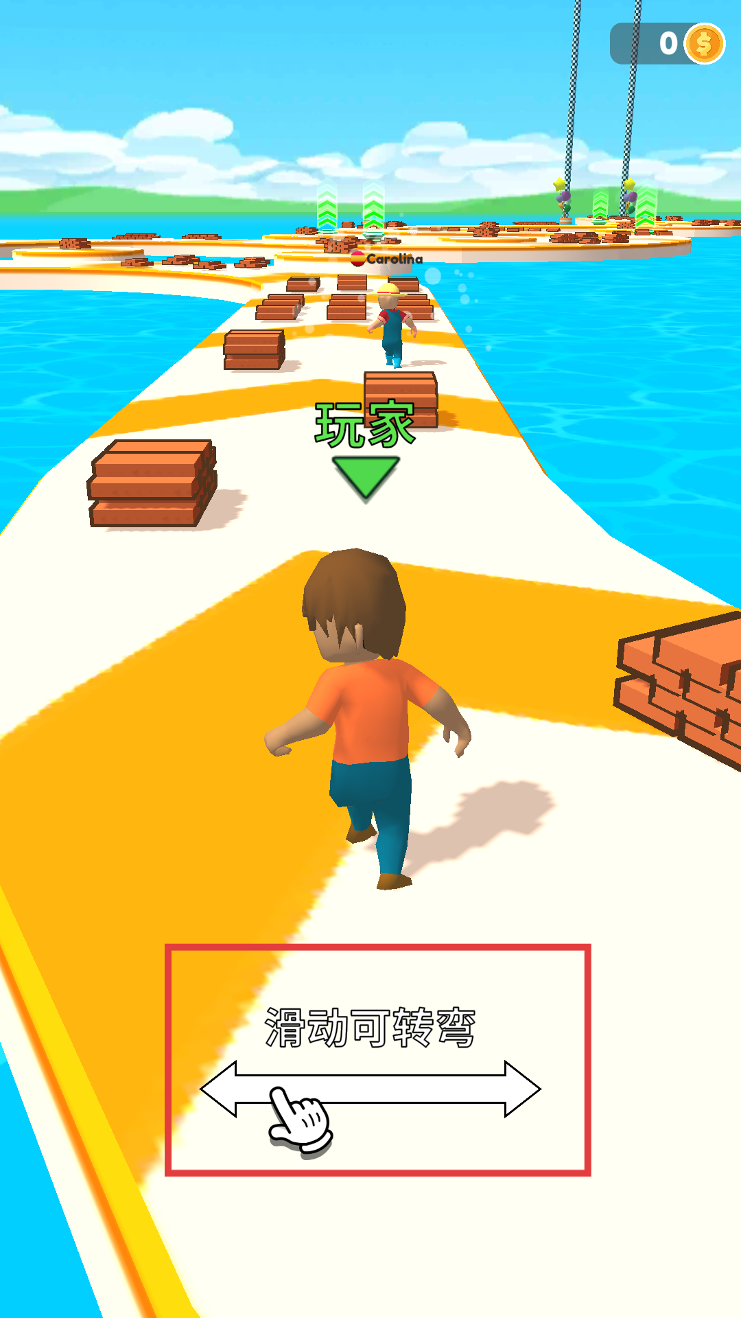 1、游戲開始時,通過滑動屏幕控制角色轉(zhuǎn)彎,躲避障礙物,在水上賽道中快速前進。