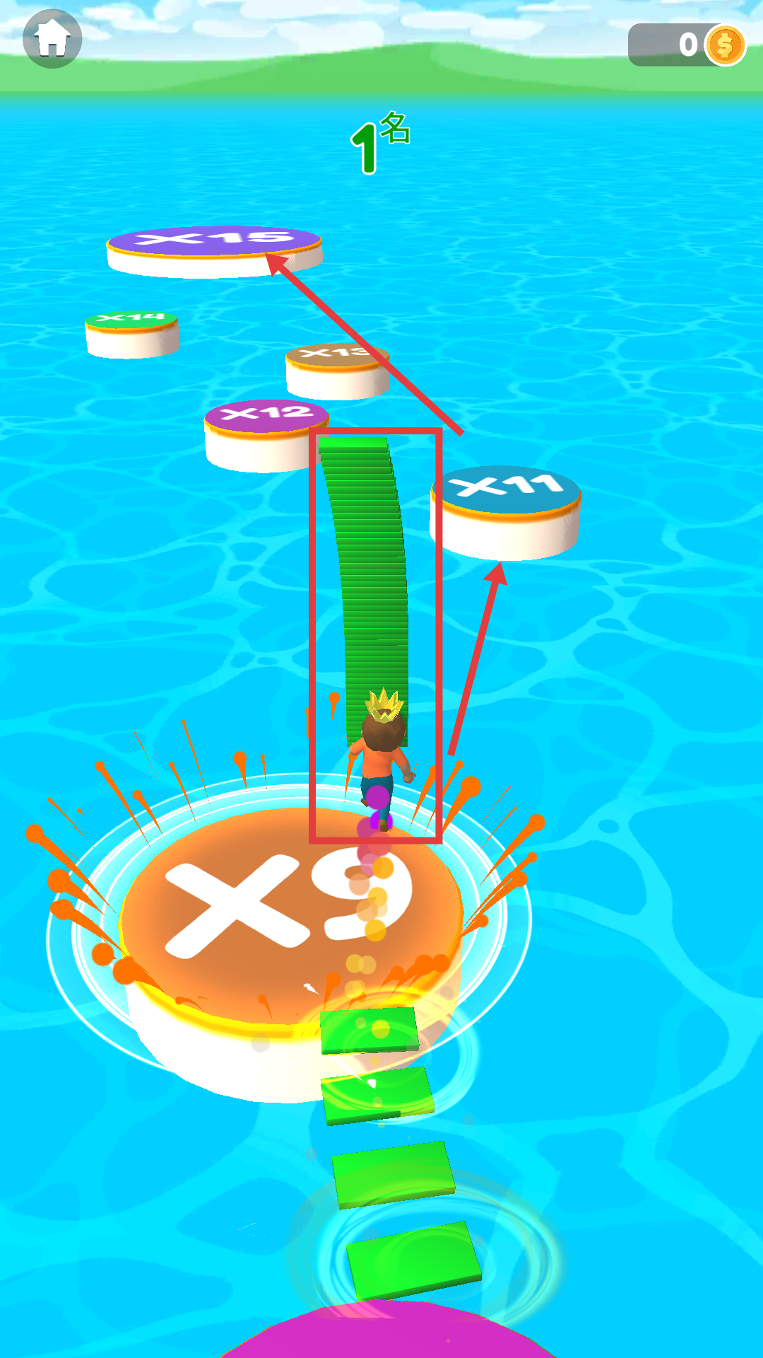 3、在跳躍環(huán)節(jié),選擇高倍數(shù)的平臺,通過綠色臺階跳躍到目標(biāo)平臺,擴大領(lǐng)先優(yōu)勢。