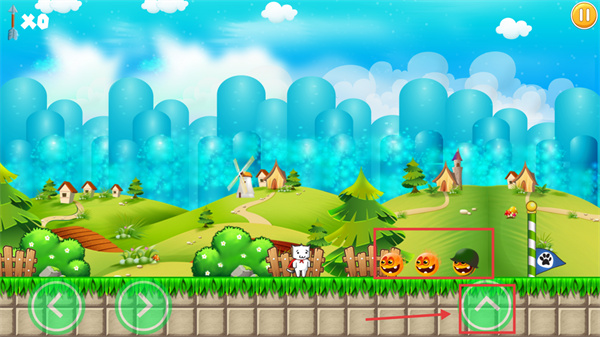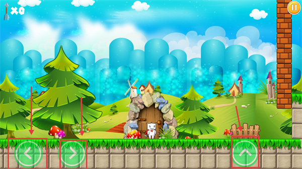 2、利用左下角左右方向鍵控制小貓移動,右下角跳躍鍵讓小貓?zhí)S,在有蘑菇、風(fēng)車的場景中探索前進。