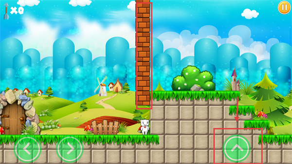 3、遇到磚墻等障礙時,及時點擊跳躍鍵,讓小貓?zhí)S越過障礙,繼續(xù)在有綠樹、城堡的場景中推進。