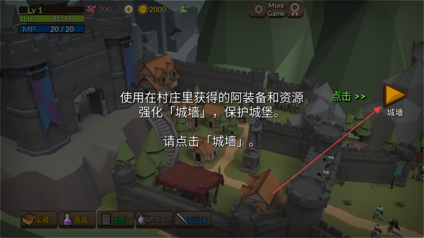 1、根據(jù)提示點擊【城墻】,使用村莊獲得的裝備和資源強化城墻,保護城堡,提升防御能力。