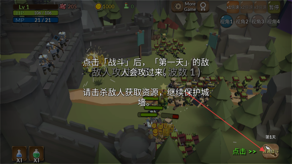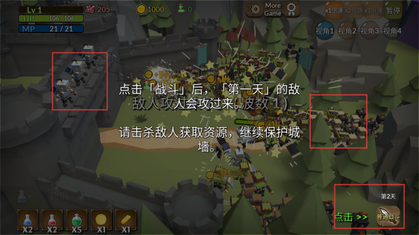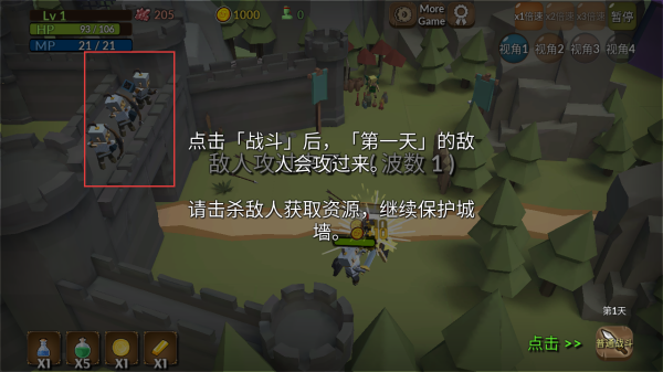 2、點擊【開始戰(zhàn)斗】,迎接「第一天」的敵人攻擊,擊殺敵人獲取資源,繼續(xù)保護城墻。