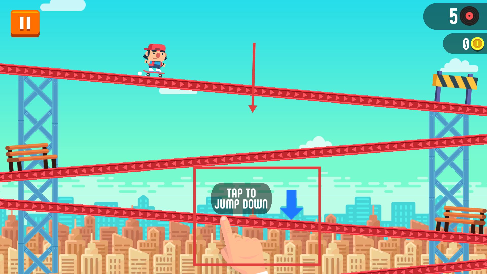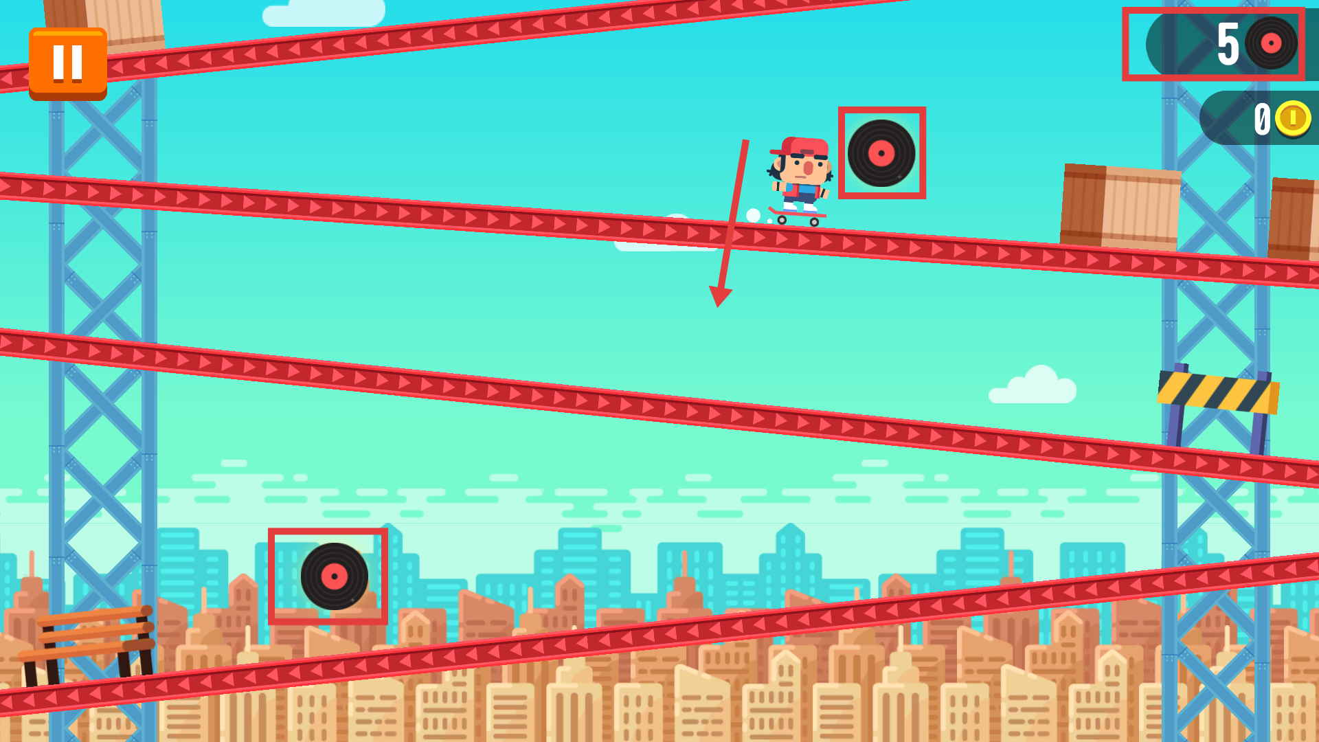 1、點擊開始按鈕,進入城市賽道,控制滑板角色在多層軌道上移動。