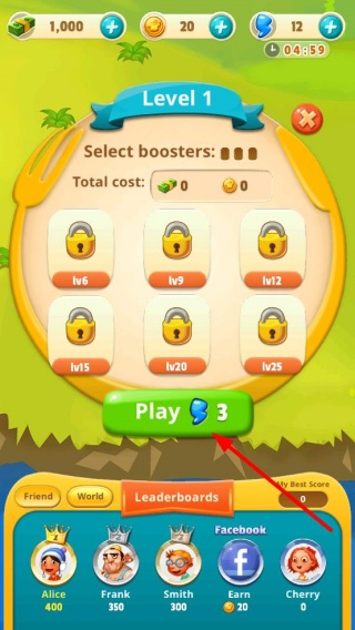 1、在Level-1界面點(diǎn)擊【Play-3】按鈕,消耗3個(gè)道具開始游戲。