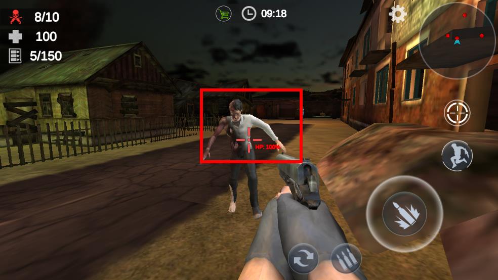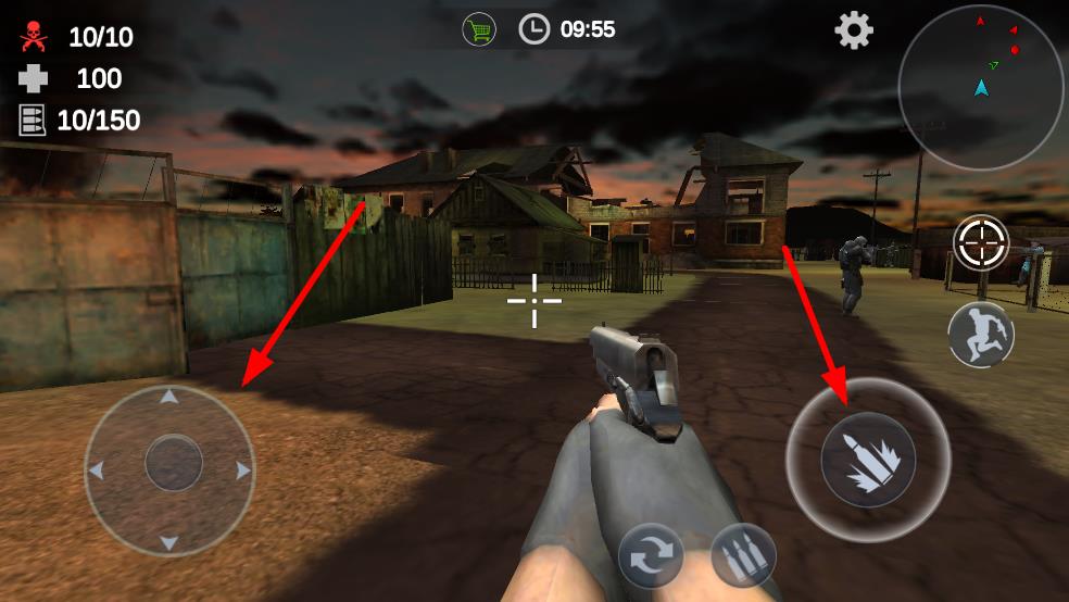 2、用左側(cè)虛擬搖桿控制移動(dòng),右側(cè)射擊按鈕攻擊敵人,同時(shí)關(guān)注【10/10】擊殺目標(biāo)和剩余時(shí)間。
