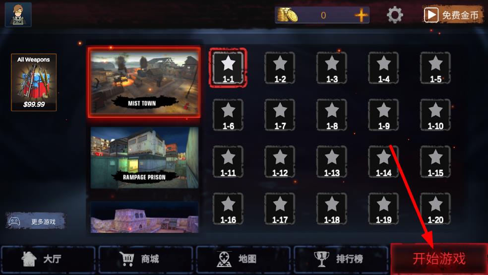 1、選擇【1-1】關(guān)卡后點(diǎn)擊【開始游戲】按鈕,進(jìn)入MIST-TOWN場(chǎng)景開啟戰(zhàn)斗。