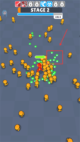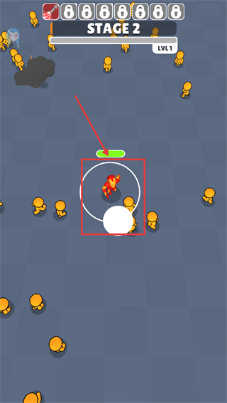 2、在游戲中,操控英雄角色在黃色小人中戰(zhàn)斗,利用攻擊范圍清理敵人,推進(jìn)關(guān)卡。