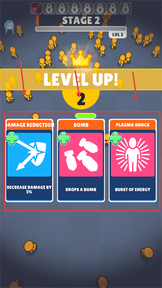 4、升級(jí)時(shí)可以從三個(gè)技能中選擇一個(gè),提升防御與攻擊,增強(qiáng)戰(zhàn)力。