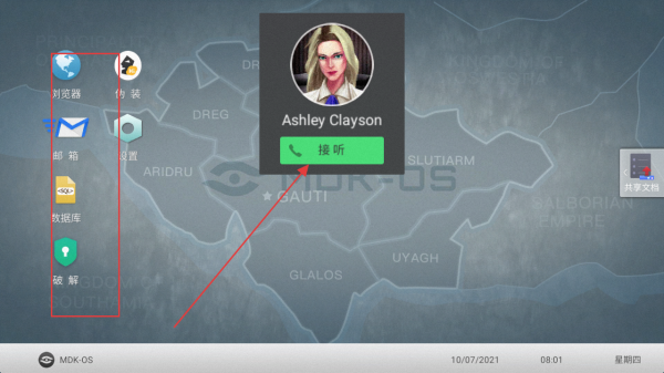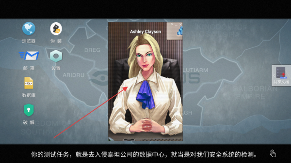 3、接聽(tīng)【Ashley-Clayson】的來(lái)電,獲取測(cè)試任務(wù)的關(guān)鍵信息,同時(shí)熟悉左側(cè)【瀏覽器-偽裝-郵箱-設(shè)置-數(shù)據(jù)庫(kù)-破解】等功能入口。