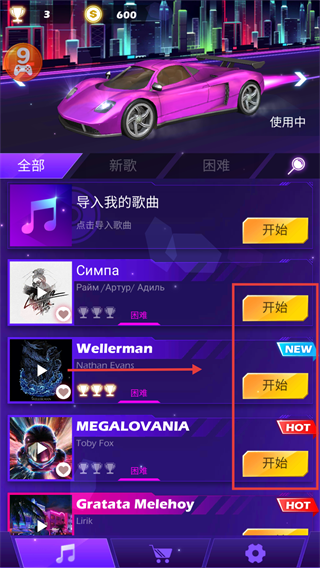 1、選擇喜歡的歌曲和車輛,點(diǎn)擊“開始”按鈕,駕駛賽車開啟音樂(lè)賽車冒險(xiǎn)。
