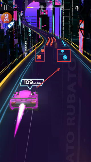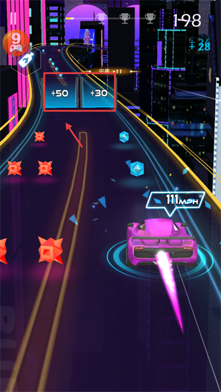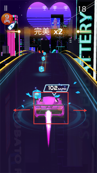 2、在霓虹賽道上操控粉色賽車左右移動(dòng),收集藍(lán)色寶石,達(dá)成“完美×2”可以提升評(píng)分