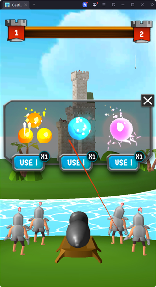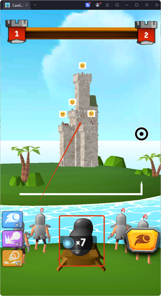2、戰(zhàn)斗中操作大炮,瞄準(zhǔn)敵方城堡上的目標(biāo),利用【×7】炮彈數(shù)量發(fā)起攻擊,削弱敵方防御。
