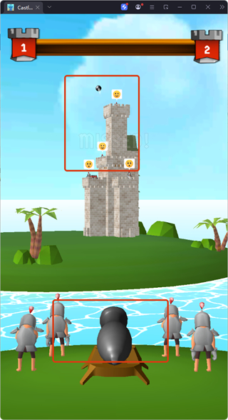 3、發(fā)射炮彈后,留意攻擊是否命中,若未命中需調(diào)整瞄準(zhǔn)角度,繼續(xù)用大炮攻擊敵方城堡。