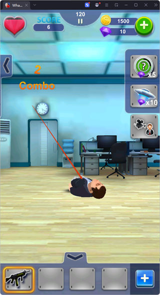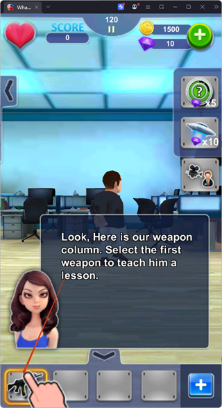2、按照提示選擇第一個武器,利用武器攻擊老板,開始積累分?jǐn)?shù),提升游戲進(jìn)度。