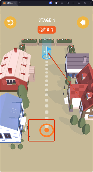 2、點擊下方橙色圓圈,發(fā)射物體,使其沿著路徑向藍色旗幟目標前進,推進游戲進程。