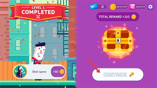 4、關(guān)卡【LEVEL-1】完成后,點(diǎn)擊【CONTINUE】按鈕,開啟寶箱獲取獎勵,繼續(xù)挑戰(zhàn)下一場射擊對決啦。