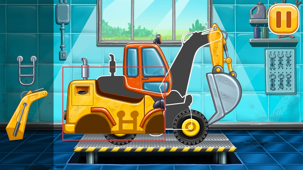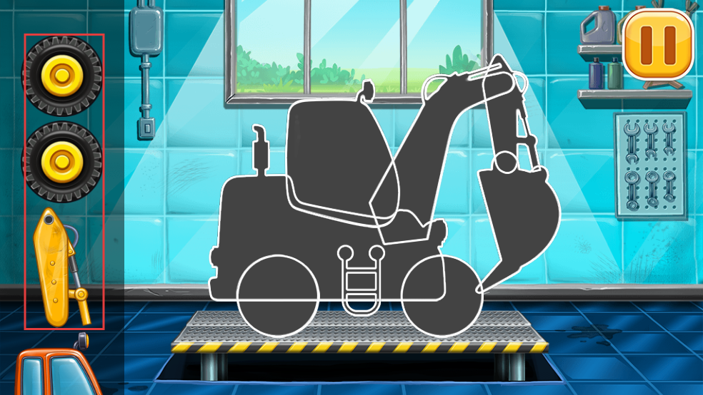 2、在組裝界面,將左側的輪胎和挖掘臂等部件拖到挖掘機輪廓的對應位置,完成初步組裝。
