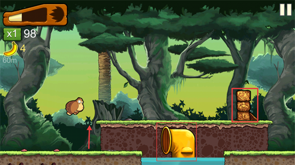 2、操控猩猩跳躍,躲避黃色管道。石像等障礙,在叢林場景中不斷前進。