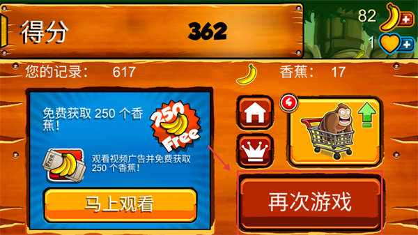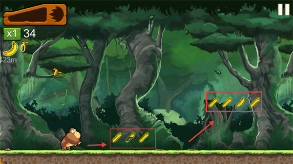 3、收集叢林中的香蕉和黃色道具,積累資源以提升得分,可以升級技能和兌換道具。
