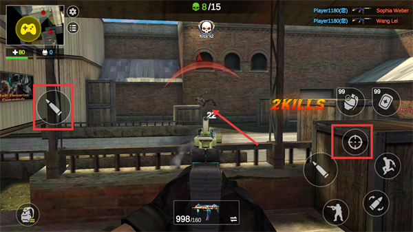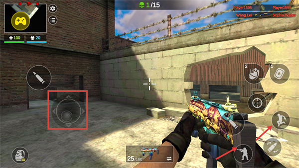 2、戰(zhàn)斗時(shí),通過左側(cè)移動(dòng)搖桿控制角色移動(dòng),熟悉右側(cè)武器切換、疾跑等操作按鈕,利用掩體推進(jìn)。