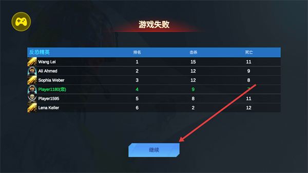 4、游戲失敗后點(diǎn)擊“繼續(xù)”按鈕,查看對戰(zhàn)排名和擊殺數(shù)據(jù),總結(jié)經(jīng)驗(yàn)后再次挑戰(zhàn)。