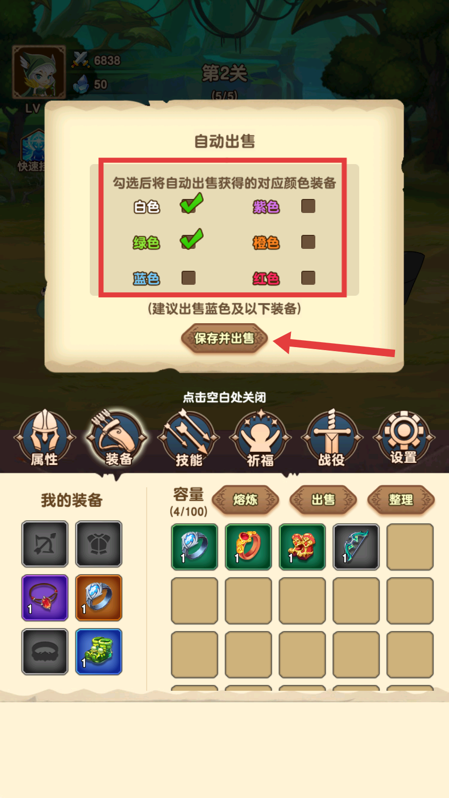 1、在裝備界面設(shè)置【自動(dòng)出售】,勾選白色、綠色裝備,點(diǎn)擊【保存并出售】,自動(dòng)處理低品質(zhì)裝備,輕松節(jié)省整理時(shí)間呢。