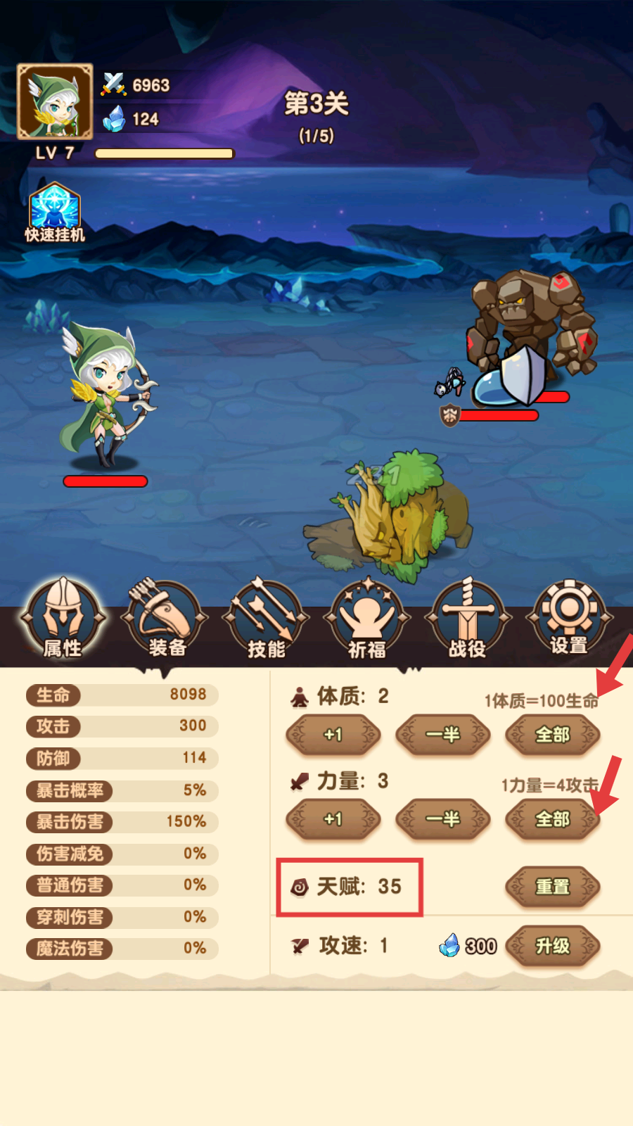 2、進(jìn)入屬性界面,利用天賦點(diǎn)數(shù)合理分配體質(zhì)、力量的加點(diǎn),提升生命與攻擊屬性哦。