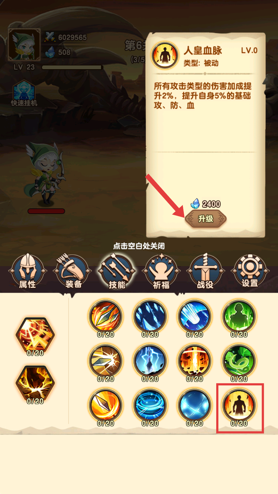 3、點(diǎn)擊【技能】中的【人皇血脈】,消耗資源點(diǎn)擊【升級(jí)】,提升所有攻擊傷害加成與基礎(chǔ)攻防血,戰(zhàn)力大幅提升呀。