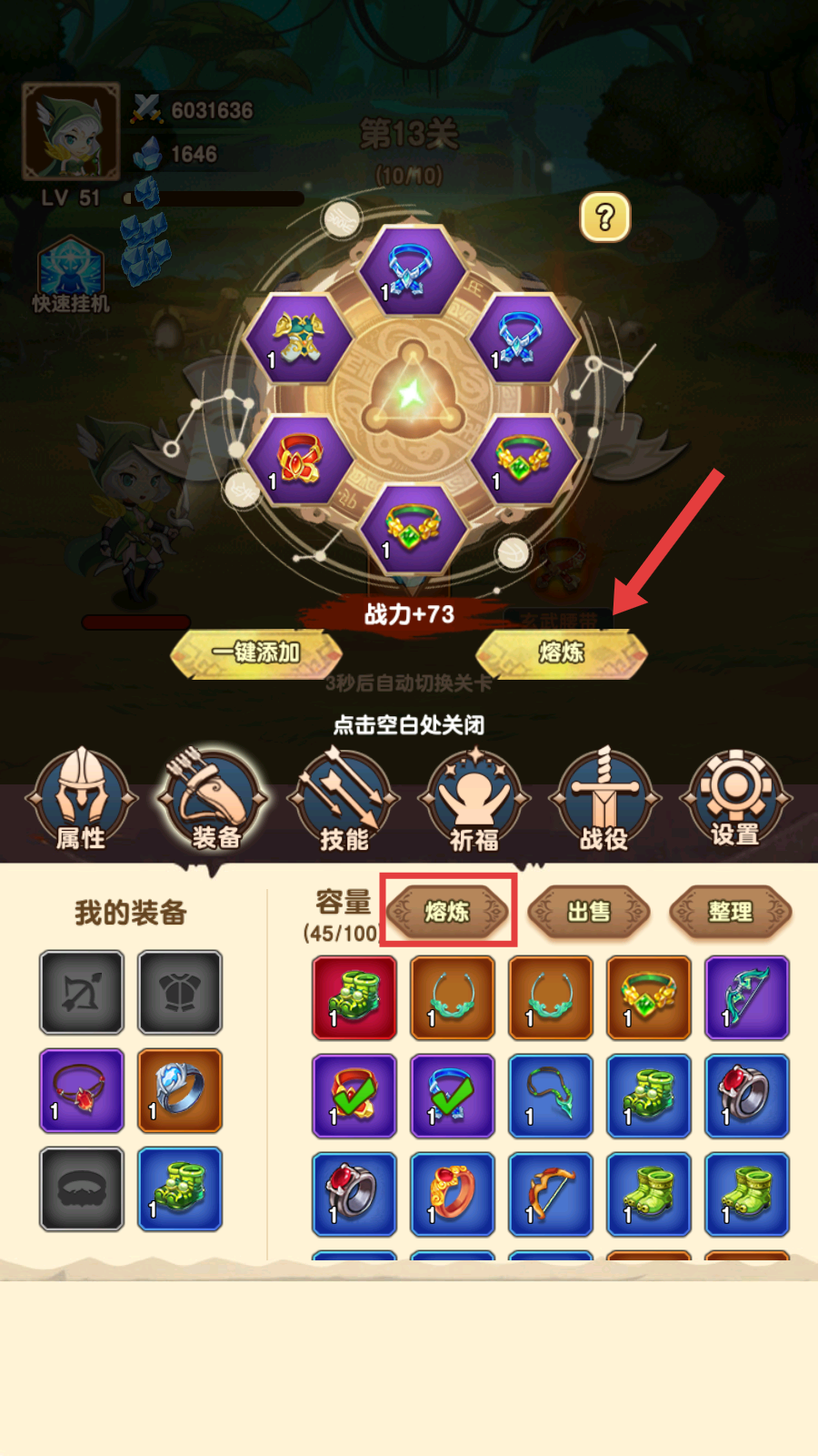 4、在裝備欄點(diǎn)擊【熔煉】按鈕,對(duì)多余裝備進(jìn)行熔煉,快速提升戰(zhàn)力,助力后續(xù)關(guān)卡挑戰(zhàn)啦。