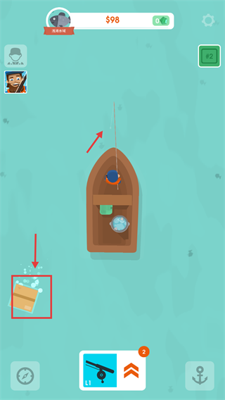 1、在初始界面操控船只釣魚,收集水下物品箱,積累金幣,開啟釣魚冒險(xiǎn)。