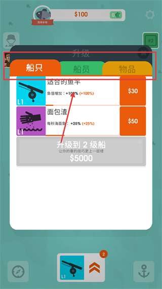2、在升級(jí)界面,可以對(duì)船只、船員、物品分類升級(jí),如提升魚竿、面包渣效果,增強(qiáng)釣魚能力。