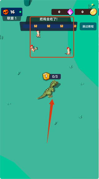 2、游戲中控制恐龍移動(dòng),完成【把雞全吃了!】的任務(wù),收集目標(biāo)物品,在場(chǎng)景中推進(jìn)游戲進(jìn)程,提升恐龍等級(jí)。