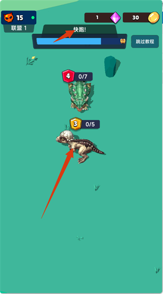 4、遇到高等級(jí)恐龍時(shí),根據(jù)提示【快跑!】及時(shí)躲避,確保自身安全,繼續(xù)在場(chǎng)景中探索,完成生存任務(wù)。