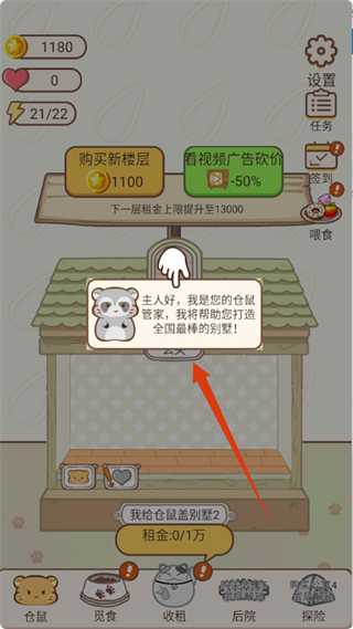 1、跟隨倉鼠管家提示,了解其將幫助打造全國最棒別墅,可點擊【購買新樓層】等功能,開啟倉鼠別墅建造之旅。