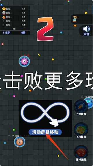 1、游戲開始前,學習【滑動屏幕移動】的操作方式,熟悉【子彈技能】【飛刀技能】【死神技能】,準備參與對戰(zhàn)。