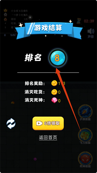 4、游戲結束后,查看【游戲結算】的排名,如排名8可獲得金幣獎勵,可選擇【6倍領取】或返回首頁。