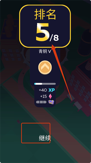 4、游戲結束后,查看排名,如【5/8】的排名可獲得經(jīng)驗和鉆石獎勵,點擊【繼續(xù)】開啟下一局。