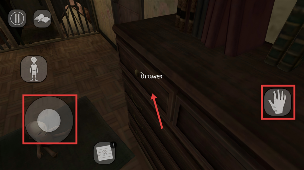 1、操控左下角搖桿移動角色到【Drawer】處,點擊右側(cè)手形按鍵,可交互探索抽屜獲取線索或道具。