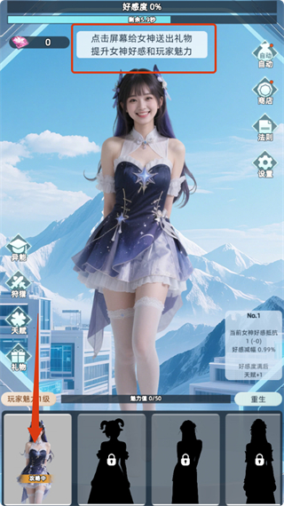 1、點擊屏幕給女神送禮物,提升女神好感和玩家魅力,按照提示操作,開啟好感培養(yǎng)之旅。