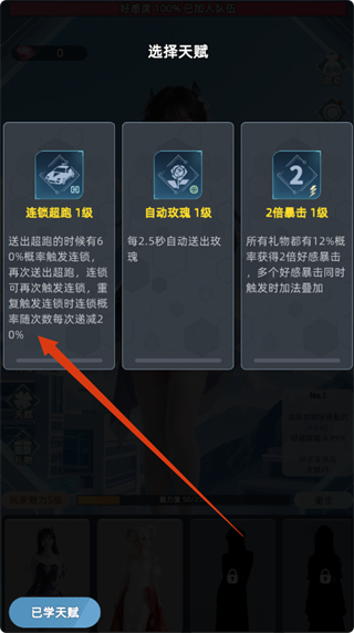 2、選擇【連鎖超跑1級】天賦,利用其連鎖效果,增加送禮物時的好感提升效率,助力好感培養(yǎng)。