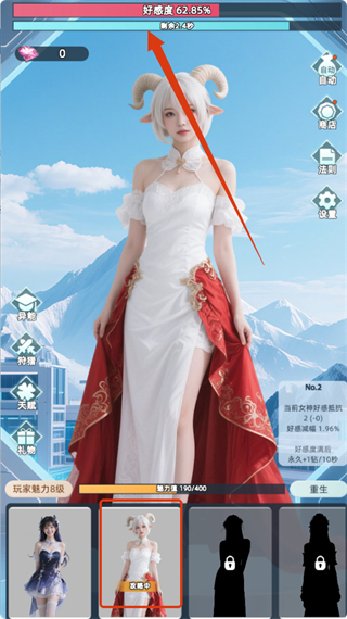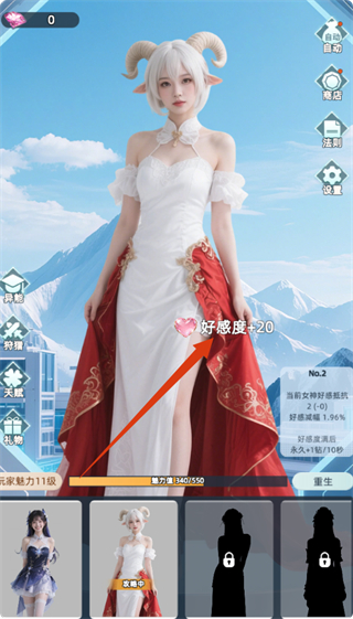 3、切換不同女神進行攻略,關注好感度進度條,持續(xù)送禮物,提升對當前女神的好感度。