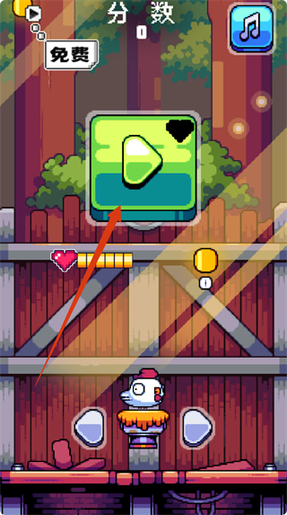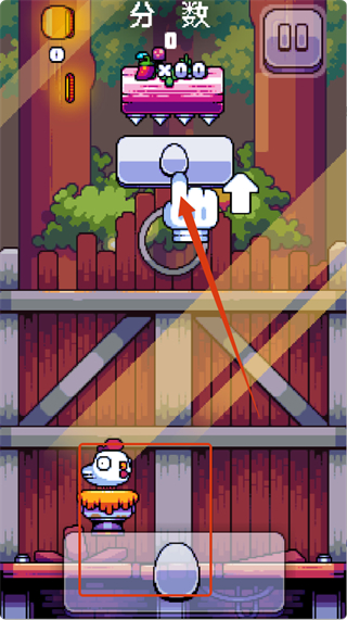 2、跟隨手指指引點(diǎn)擊按鈕,使小雞下方生成蛋,通過(guò)操作讓小雞向上移動(dòng),收集上方元素,提升分?jǐn)?shù)。