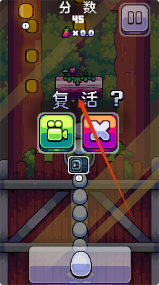 4、若游戲失敗,出現(xiàn)【復(fù)活?】提示時(shí),可選擇相應(yīng)按鈕繼續(xù)游戲,爭(zhēng)取獲得更高分?jǐn)?shù),挑戰(zhàn)自己的記錄。