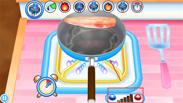 3、煎制肉類時,關注右下角火候調節(jié)區(qū)域,根據(jù)提示調整火候,確保肉類煎制效果恰到好處。