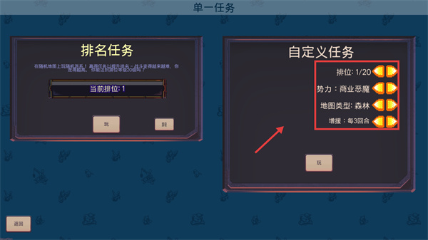 1、設(shè)置好【排位-1/20】【勢力-商業(yè)惡魔】【地圖類型-森林】【增援-每3回合】的選項,點擊【玩】開啟游戲。