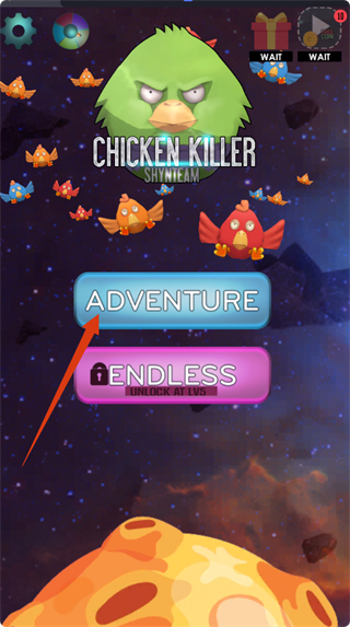 1、點(diǎn)擊【ADVENTURE】開始冒險(xiǎn),界面中【Chicken-Killer】的標(biāo)題提示這是一款射擊類游戲,開啟打雞挑戰(zhàn)。